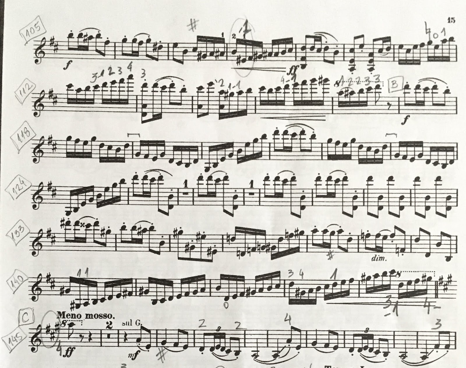 - Bars 188 to 196 (intonation of note by note, playing twice each octave, that is, even in ultra slow tempo putting the elements of the fast tempo I already can… I also noticed that the string crossings are a trap for the left hand.)