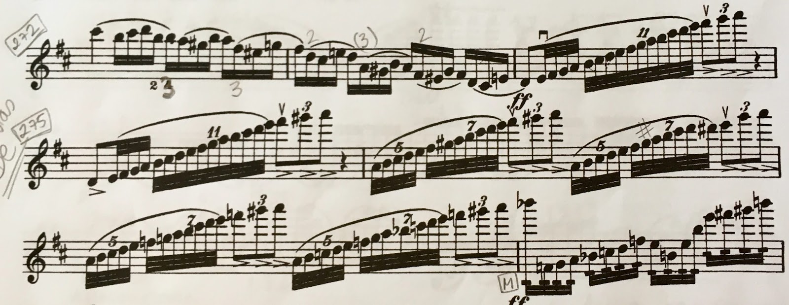 - Bars 183 to 188 (I practiced this recently, so the improvements are still here. I practiced intonation and constructive rests. I noticed that my left hand was unstable in the tenths on bars 183, 184 and 185, and I practiced keeping always the 1st finger on the D as a pivot.)